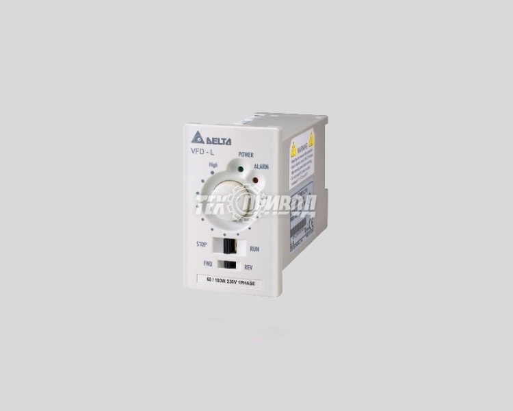 Частотный преобразователь Delta Electronics VFD001L21A управляет трехфазным двигателем методом широтно-импульсной модуляции. Частотник располагает двумя аналоговыми и тремя дискретными входами, двумя релейными и одним дискретным выходами. Обмен данными происходит по интерфейсу RS-485 c использованием протокола ModBus RTU. Номинальная мощность преобразователя VFD001L21A составляет 0,1 кВт, номинальный ток — 0,8 А.